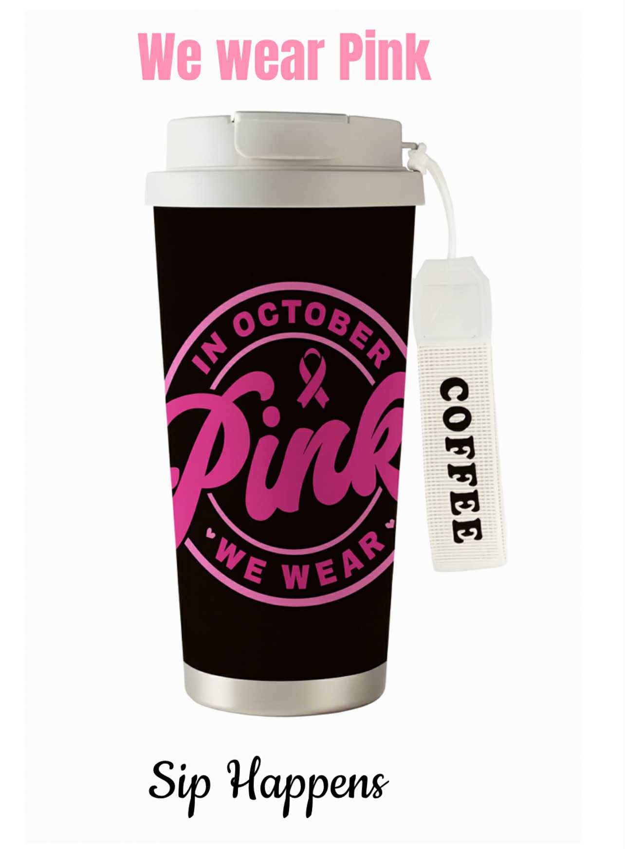 Show your support in style with our “We Wear Pink” Breast Cancer Awareness tumbler Perfect for your favorite Sip Happens drink, this sleek black and pink travel cup proudly features the empowering message “In October We Wear Pink” wrapped around the signature ribbon symbol.