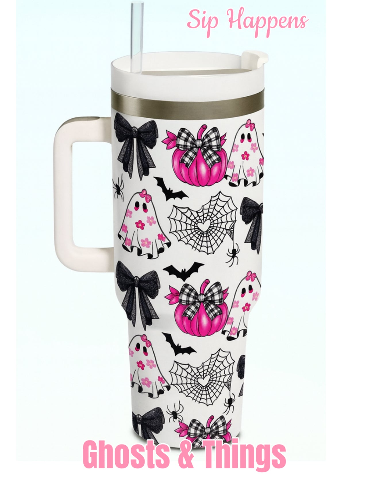 Bring a little spooky-cute style to your sips with the Ghosts & Things tumbler! This oversized 40oz travel mug features playful pink ghosts, pumpkins, bats, spider webs, and bows — a festive design that’s both fun and functional.